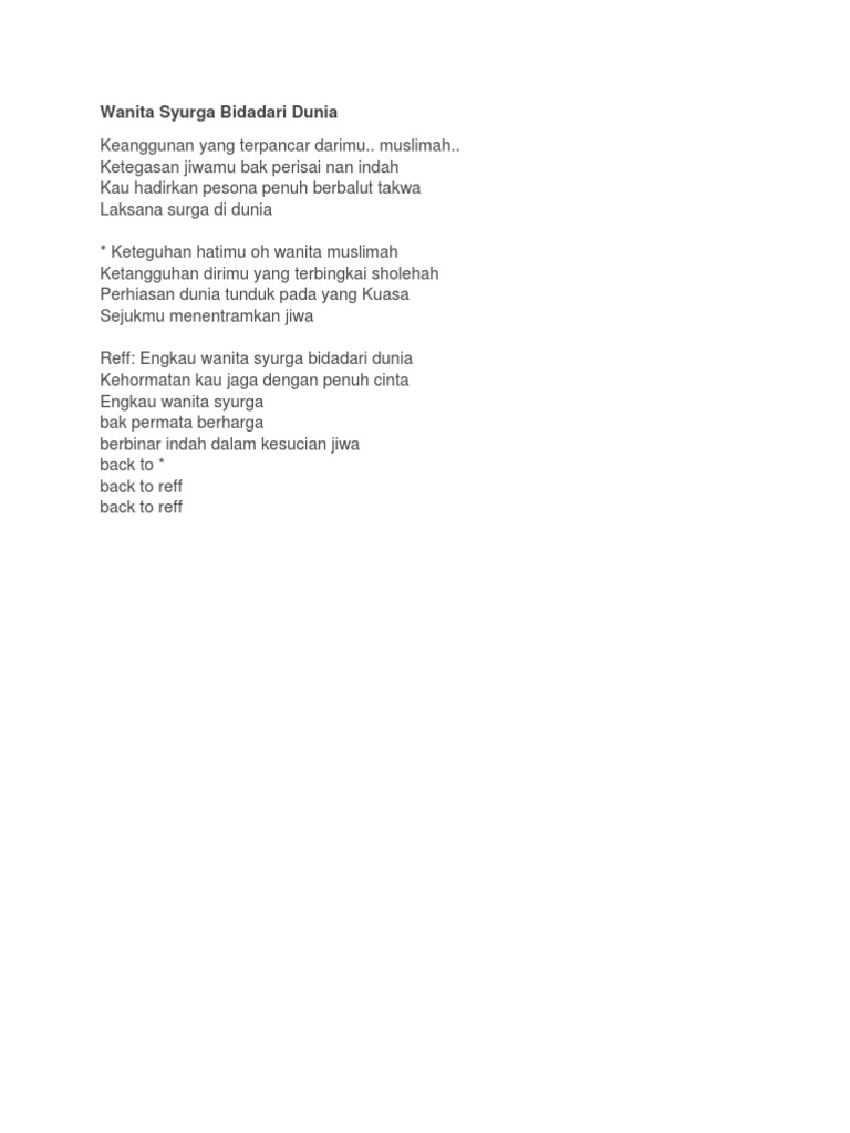 Berikut cuplikan syair nyanyian teks dari lagunya. Ketegasan jiwamu bak perisai nan indah Kau hadirkan persona penuh berbalut takwah Laksana syurga di dunia Keteguhan hatimu oh wanita muslimah Ketangguhan dirimu yang terbingkai sholehah Perhiasan dunia tunduk pada yang kuasa Sejukmu. About Press Copyright Contact us Creators Advertise Developers Terms Privacy Policy Safety How YouTube works Test new features Press Copyright Contact us Creators.